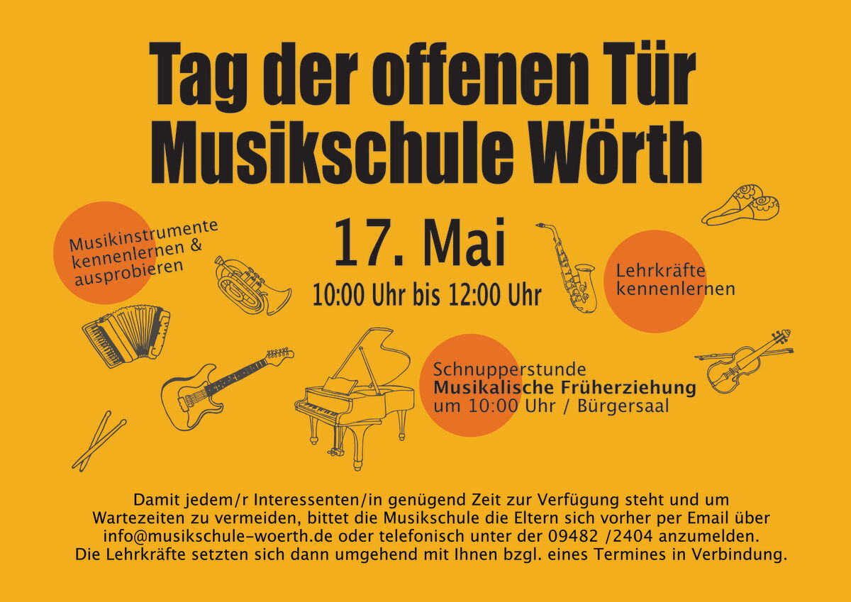 Damit jedem/r Interessenten/in genügend Zeit zur Verfügung steht und um Wartezeiten zu vermeiden, bittet die Musikschule die Eltern sich vorher per Email über info@musikschule-woerth.de oder telefonisch unter der 09482 /2404 anzumelden.