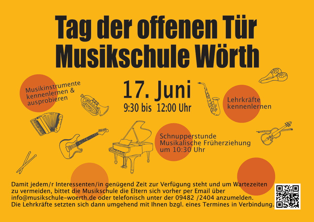 Damit jedem/r Interessenten/in genügend Zeit zur Verfügung steht und um Wartezeiten zu vermeiden, bittet die Musikschule die Eltern sich vorher per Email über info@musikschule-woerth.de oder telefonisch unter der 09482 /2404 anzumelden.
